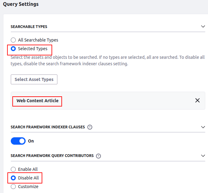 - Paste a 'MUST' elasticsearch query to filter web contents having fieldSample=sample. Could be similar to the following json (verify elasticsearch index to check the IDs and field name/value and adapt this code to your specific environment configuration):